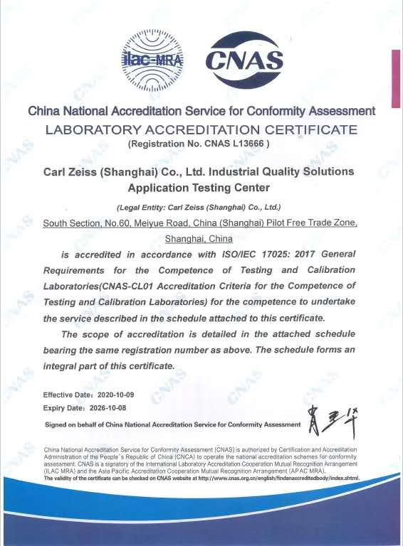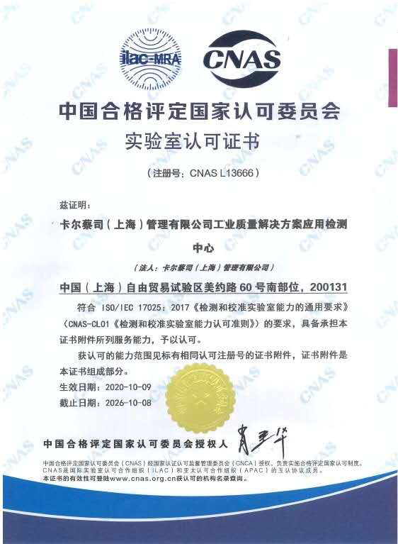 近日,卡尔南川蔡司(上海)管理有限公司工业质量解决方案应用检测中心经过中国合格评定国家认可委员会(CNAS)严格的现场评审和后续考察,正式通过了最终审评并获得实验室国家认可证书。至此,标志着蔡司应用检测中心具有了国家及国际认可的管理水平和校准能力。